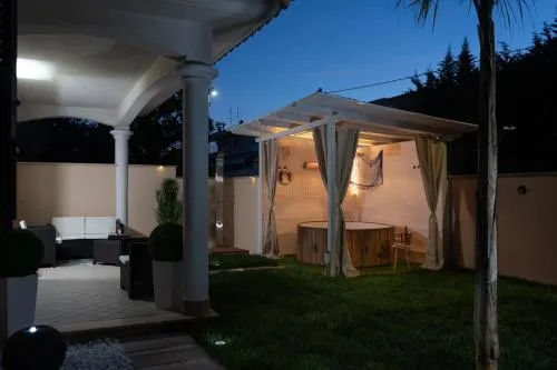 This holiday home's standout features are the hot tub, spa bath and fireplace. Boasting a private entrance, this air-conditioned holiday home comes with 1 living room, 2 separate bedrooms and 1 bathroom with a walk-in shower and a bidet. Guests will find a stovetop, a refrigerator, kitchenware and an oven in the fully equipped kitchen. The holiday home also includes a barbecue. This holiday home has a washing machine, flat-screen TV with streaming services, garden views, as well as wine/champagne for guests. The unit has 4 beds.