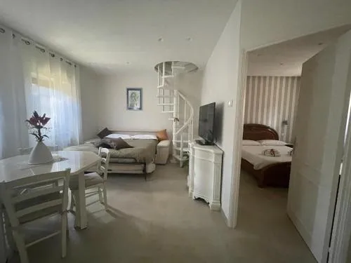 Boasting a private entrance, this air-conditioned holiday home features 1 living room, 1 separate bedroom and 1 bathroom with a shower and a bidet. A kitchen fitted with a stovetop, a refrigerator and kitchenware is available for cooking and storing food. This holiday home has a tea and coffee maker, flat-screen TV, garden views, as well as chocolate for guests. The unit has 2 beds.