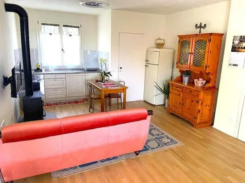 The fireplace is the standout feature of this holiday home. Boasting a private entrance, this holiday home includes 1 living room, 1 separate bedroom and 1 bathroom with a walk-in shower and a bath or a shower. Guests will find a stovetop, a refrigerator and kitchenware in the kitchen. The holiday home also features a barbecue. The holiday home offers a washing machine, a tea and coffee maker, a seating area as well as a terrace with garden views. The unit has 2 beds.