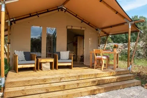 Guests will find a stovetop, a refrigerator, kitchenware and a microwave in the fully equipped kitchenette. The tent also includes a barbecue. The tent features a private entrance, a coffee machine, a terrace with garden views as well as a private bathroom boasting a shower. The unit has 1 bed.