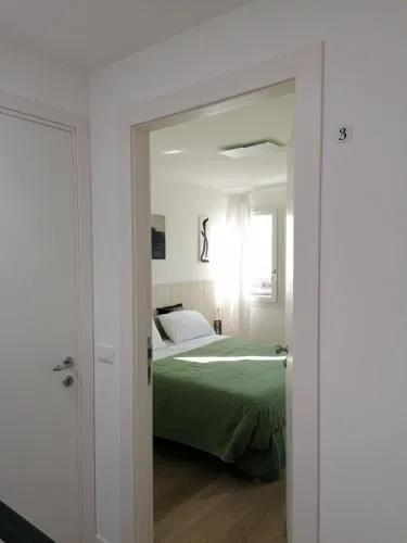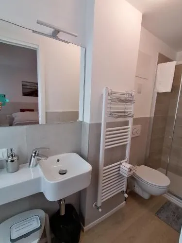 The twin/double room offers air conditioning, a coffee machine, as well as a private bathroom featuring a walk-in shower and a hairdryer. The well-fitted kitchen features a stovetop, a refrigerator, kitchenware and a microwave. The twin/double room has parquet floors and features a dining area, a wardrobe and a quiet street view.