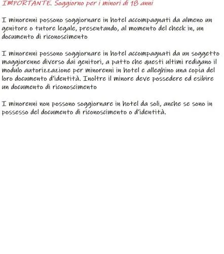 | Bambini con letti supplementari | Sono ammessi bambini di tutte le età. I bambini fino a 17 anni inclusi possono soggiornare al costo di € 10 a persona a notte in uno dei letti già presenti. Non hai aggiunto culle. Non hai aggiunto letti supplementari. I supplementi non sono inclusi nell’importo totale e devono essere pagati separatamente durante il soggiorno. |