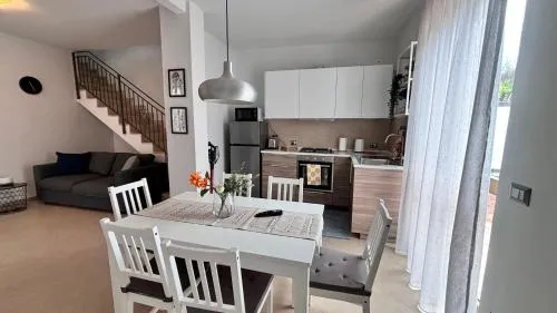 Featuring a private entrance, this air-conditioned holiday home is comprised of 1 living room, 2 separate bedrooms and 2 bathrooms with a shower and a bidet. In the kitchen, guests will find a stovetop, a refrigerator, an oven and a microwave. The holiday home offers a washing machine, a coffee machine, a dining area, a flat-screen TV, as well as garden views. The unit offers 3 beds.