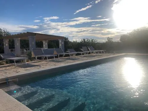 Vivrete un'esperienza speciale in quanto questa casa vacanze dispone di una piscina con vista e di un camino. Questa casa vacanze climatizzata presenta un ingresso indipendente, 1 soggiorno, 1 camera da letto separata e 1 bagno con doccia e bidet. Avrete a disposizione una cucina con piano cottura, frigorifero e utensili. Presso la casa vacanze troverete un barbecue. La casa vacanze è dotata di pareti insonorizzate, macchina da caffè, area salotto, TV a schermo piatto e vista sul giardino. L’alloggio offre 2 letti.