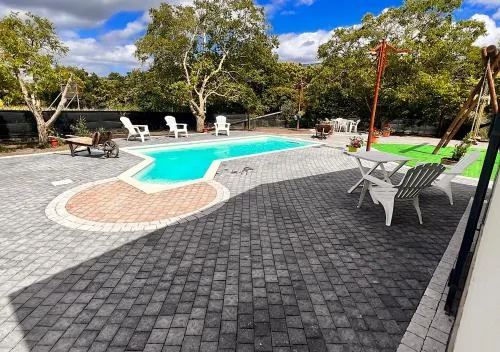 This holiday home's standout features are the private pool and fireplace. Featuring a private entrance, this holiday home consists of a kitchen, 2 bedrooms and 2 bathrooms with a walk-in shower and a bidet. The well-fitted kitchen features a stovetop, a refrigerator, kitchenware and an oven. The holiday home provides a washing machine, a tea and coffee maker, a dining area, a flat-screen TV with streaming services, as well as garden views. The unit offers 7 beds.