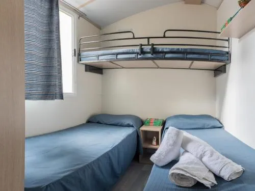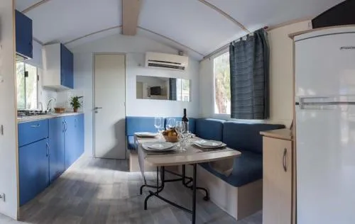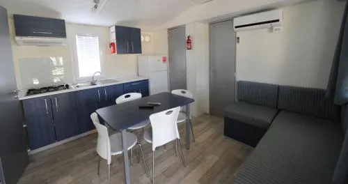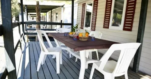Climatizzata e dotata di ingresso privato, questa casa mobile include 1 camera da letto e 1 bagno con doccia. Troverete un angolo cottura con frigorifero, fornelli e utensili da cucina. La casa mobile offre anche un barbecue, La casa mobile dispone di pavimento in legno, area salotto con TV a schermo piatto, zona pranzo, armadio e vista sul giardino. L’unità presenta 4 letti.
