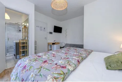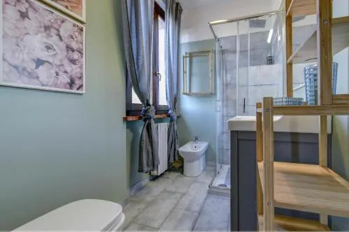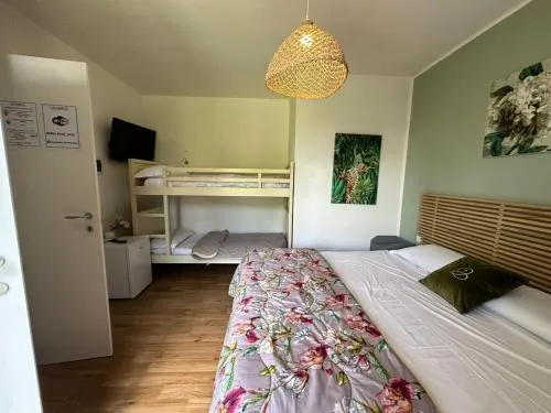 Camera familiare climatizzata dotata di TV a schermo piatto con servizi di streaming, bagno privato e terrazza vista giardino. L'alloggio dispone di 2 letti.