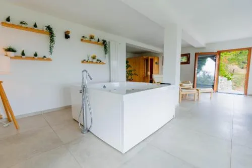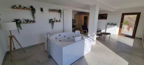 This chalet features a hot tub, spa bath and sauna. Boasting a private entrance, this air-conditioned chalet includes 1 living room, 2 separate bedrooms and 2 bathrooms with a shower and a bidet. Guests will find a stovetop, a refrigerator, a dishwasher and kitchenware in the well-fitted kitchen. The chalet also features a barbecue. The spacious chalet offers a flat-screen TV with streaming services, a minibar, a coffee machine, a seating area as well as garden views. The unit has 3 beds and 1 futon.