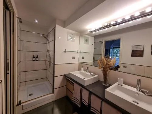 The double room features a tea and coffee maker, a wardrobe, a balcony with garden views as well as a private bathroom boasting a shower. The unit has 2 beds.