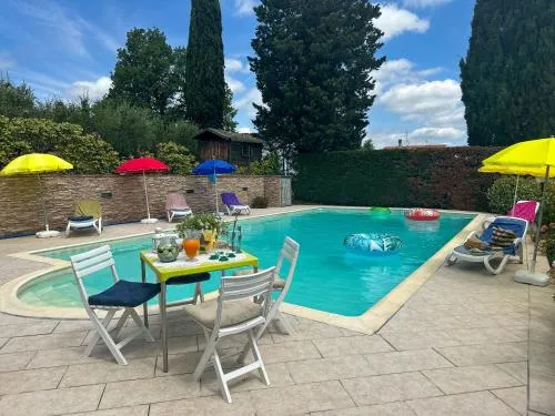 This holiday home's special features are the pool with a view and the fireplace. Featuring a private entrance, this air-conditioned holiday home is comprised of 2 living rooms, 2 separate bedrooms and 3 bathrooms with a shower and a bidet. Guests will find a stovetop, a refrigerator, a dishwasher and kitchenware in the well-equipped kitchen. The holiday home also has a barbecue. The spacious holiday home offers a flat-screen TV with cable channels, a washing machine, a coffee machine, a seating area as well as garden views. The unit offers 4 beds.