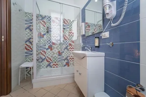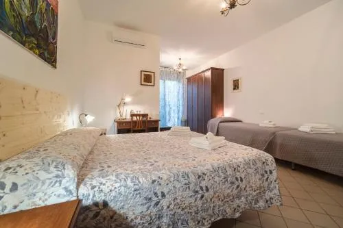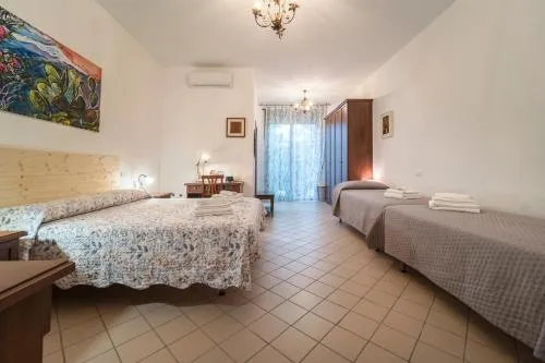 Camera quadrupla dotata di aria condizionata, armadio, balcone con vista sul giardino e bagno privato con doccia a filo pavimento. L’alloggio presenta 3 letti.