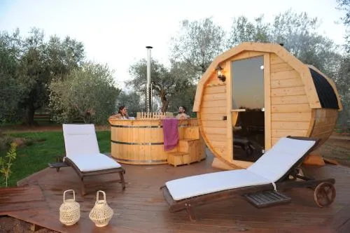 Guests will have a special experience as this tent features a pool with a view, a hot tub and a sauna. The tent provides air conditioning, a private entrance, as well as a private bathroom featuring a bath and a shower. The tent offers a dressing room, heating, as well as a terrace and outdoor furniture. The unit offers 1 bed.