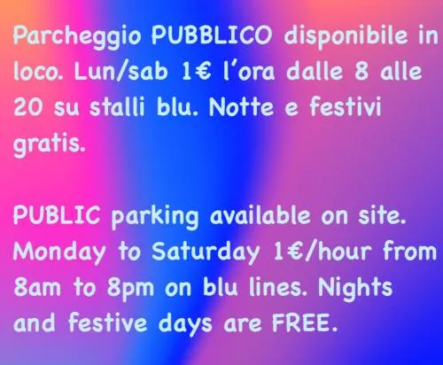 | Parcheggio | Parcheggio pubblico disponibile in loco senza prenotazione al costo di 1 EUR all'ora . |