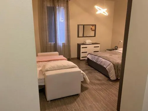 Camera familiare climatizzata dotata di TV a schermo piatto con servizi di streaming, bagno privato e terrazza vista giardino. L'alloggio dispone di 2 letti.